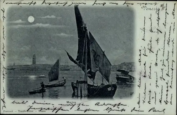 Mondschein Ak Venezia Venedig Veneto, Marina, Fischerboot am Ufer