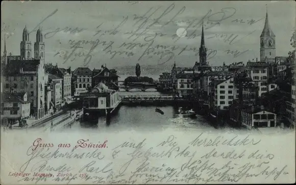 Mondschein Ak Zürich Stadt Schweiz, Teilansicht, Kirchtürme, Brücke