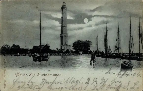 Mondschein Ak Świnoujście Swinemünde Pommern, Leuchtturm, Boote