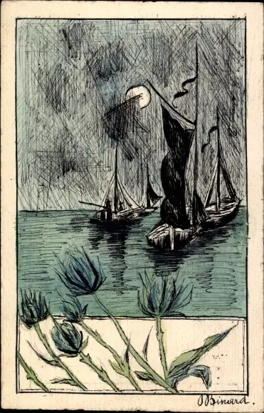 Mondschein Künstler Ak Bineard, Segelpartie, Segelboote, Blumen