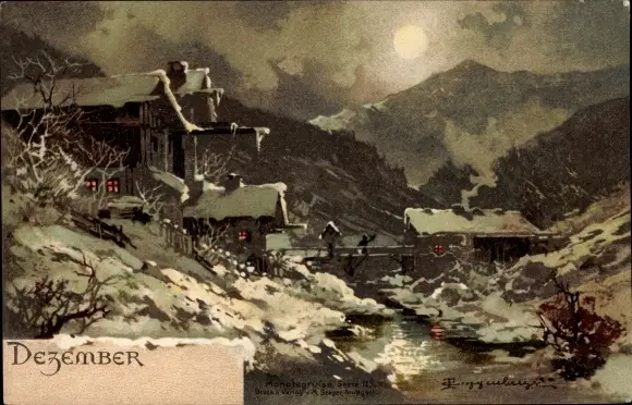 Mondschein Künstler Ak Guggenberger, Dezember, Allegorie, Winter, Flusspartie