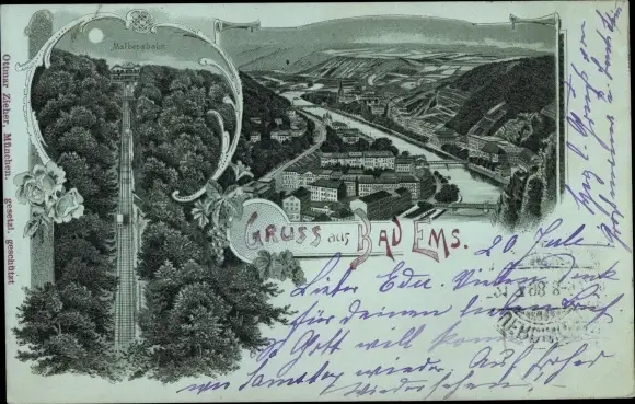 Mondschein Litho Bad Ems an der Lahn, Malbergbahn, Totalansicht