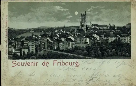 Mondschein Litho Fribourg Freiburg Stadt Schweiz, Gesamtansicht