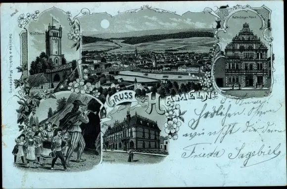 Mondschein Litho Hameln an der Weser, Rattenfänger Haus, Klütturm, Hochzeitshaus, Totalansicht