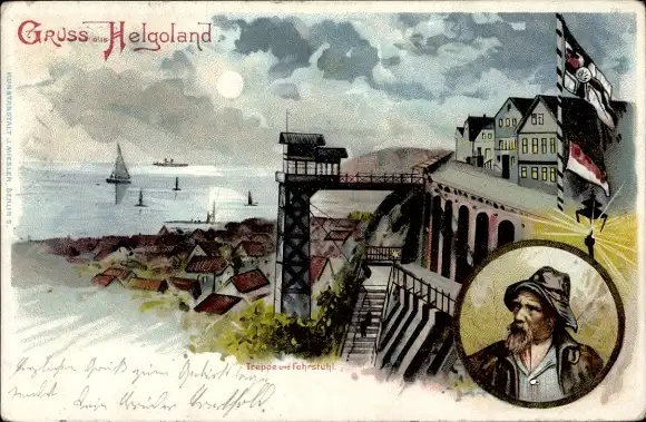 Mondschein Litho Helgoland, Treppe und Fahrstuhl, Mann