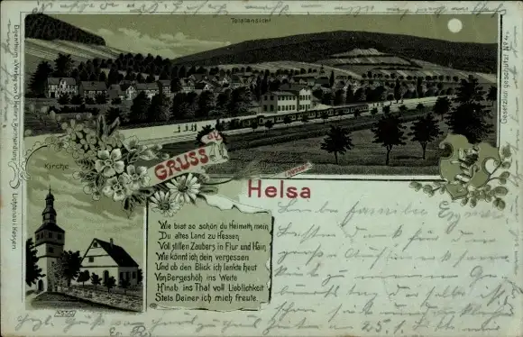 Mondschein Litho Helsa in Hessen, Gesamtansicht, Kirche, Gedicht
