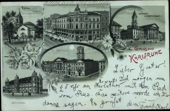 Mondschein Litho Karlsruhe in Baden, Evang. Stadtkirche, Rathaus, Gottesau