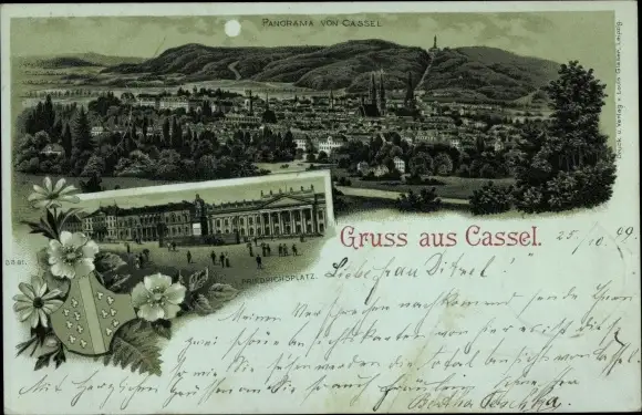 Mondschein Litho Kassel in Hessen, Panorama, Friedrichsplatz, Wappen
