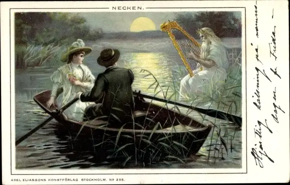 Mondschein Litho Liebespaar beim Rudern, Necken, Mann Harfe spielend