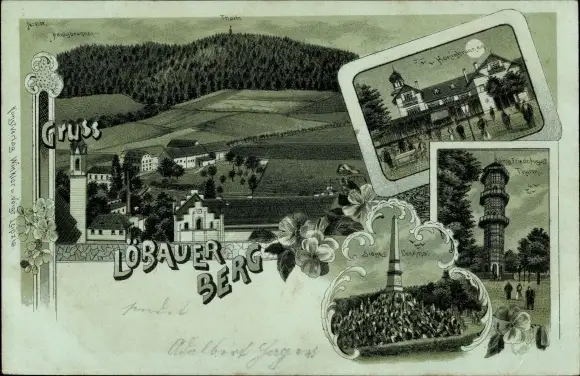 Mondschein Litho Löbau in Sachsen, Löbauer Berg, Honigbrunnen, Siegesdenkmal, Turm