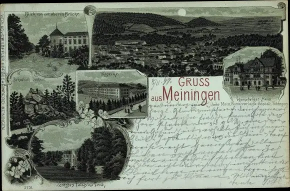 Mondschein Litho Meiningen in Thüringen, Henneberger Haus, Kaserne, Palais mit Teich