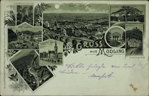 Mondschein Litho Mödling in Niederösterreich, Josefskirche, Aussichtsturm, Klausen, Ruine