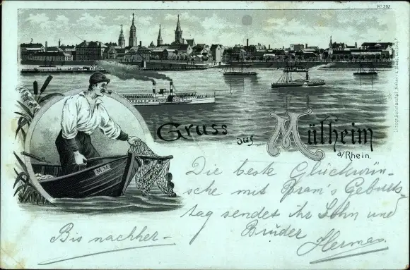 Mondschein Litho Mülheim Köln am Rhein, Fischer, Stadtansicht