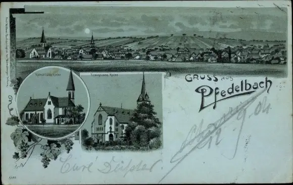 Mondschein Litho Pfedelbach in Württemberg, Kath. Kirche, Ev. Kirche