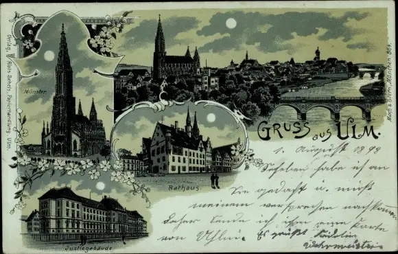 Mondschein Litho Ulm an der Donau, Rathaus, Münster, Panorama vom Ort, Justizgebäude