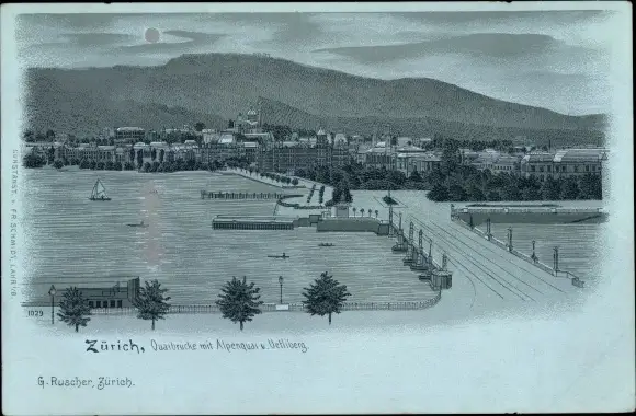 Mondschein Litho Zürich Stadt Schweiz, Quaibrücke, Alpenquai, Uetliberg am Züricher See