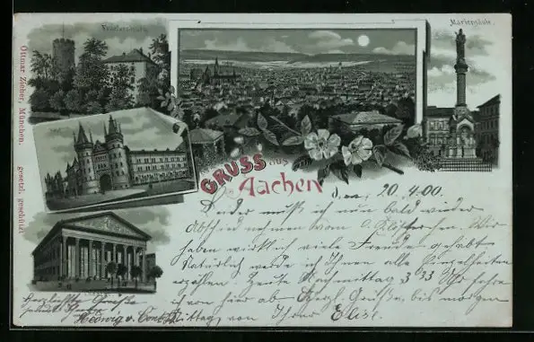 Mondschein-Lithographie Aachen, Ortsansicht, Mariensäule, Kaserne