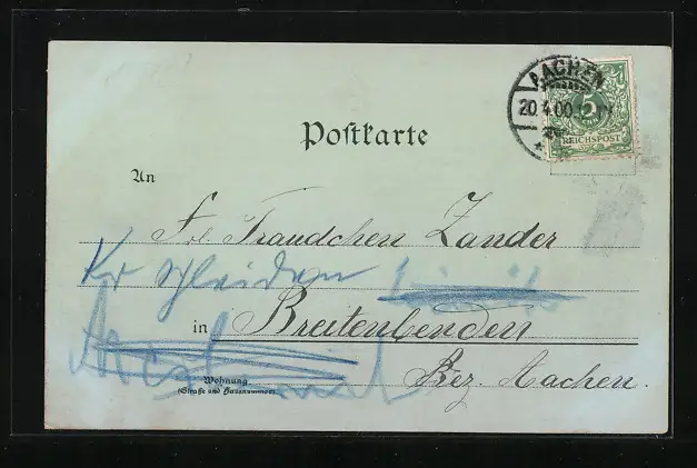 Personenbezogene Daten auf der Rückseite der Karte wurden durch blauen Textmarker unkenntlich gemacht. Die blauen Stellen sind auf die Vorderseite durchgeweicht und wirken sich negativ auf das Postkartenfoto aus