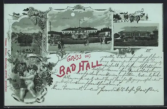Mondschein-Lithographie Bad Hall, Kurhaus, Trinkhalle, Promenade, Kind mit Weinglas