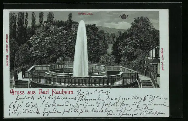 Mondschein-Lithographie Bad Nauheim, Besucher am Sprudel