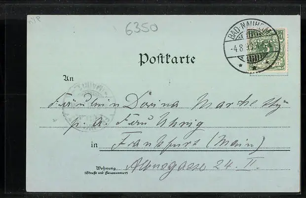 Personenbezogene Daten auf der Rückseite der Karte wurden durch blauen Textmarker unkenntlich gemacht. Die blauen Stellen sind auf die Vorderseite durchgeweicht und wirken sich negativ auf das Postkartenfoto aus