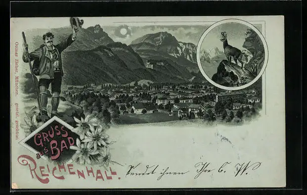 Mondschein-Lithographie Bad Reichenhall, Totalansicht mit Gebirgspanorama