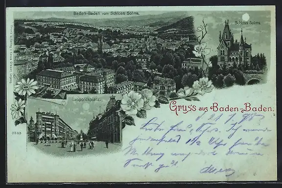 Mondschein-Lithographie Baden-Baden, Leopoldsplatz, Schloss Solms, Ortsansicht