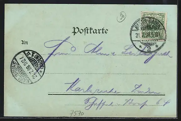 Personenbezogene Daten auf der Rückseite der Karte wurden durch blauen Textmarker unkenntlich gemacht. Die blauen Stellen sind auf die Vorderseite durchgeweicht und wirken sich negativ auf das Postkartenfoto aus