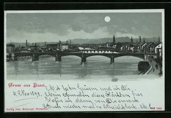 Mondschein-Lithographie Basel, Teilansicht mit Brücke