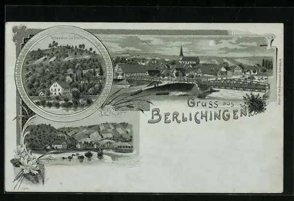 Mondschein-Lithographie Berlichingen, Restaurant zur Brücke, Seeblick, Totalansicht
