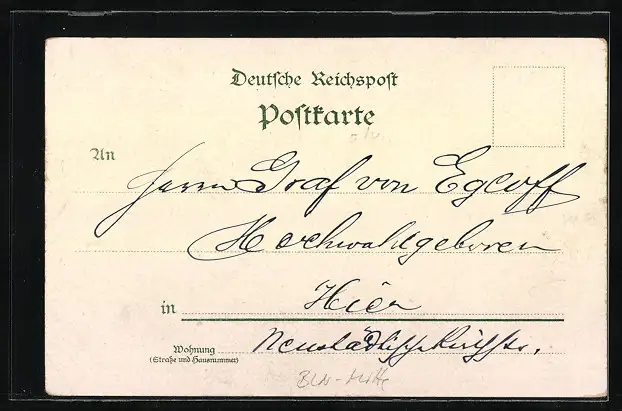 Personenbezogene Daten auf der Rückseite der Karte wurden durch blauen Textmarker unkenntlich gemacht. Die blauen Stellen sind auf die Vorderseite durchgeweicht und wirken sich negativ auf das Postkartenfoto aus