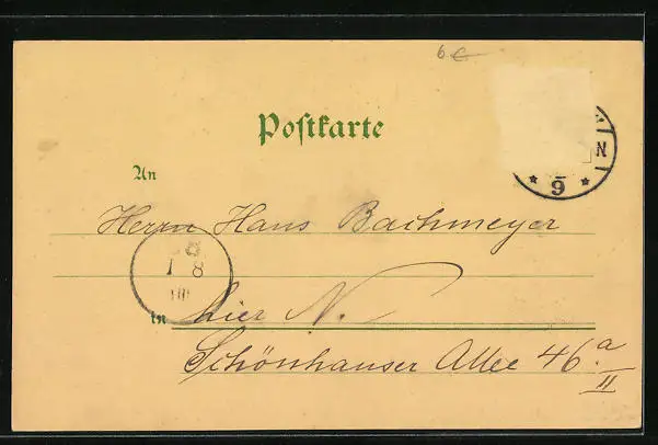 Personenbezogene Daten auf der Rückseite der Karte wurden durch blauen Textmarker unkenntlich gemacht. Die blauen Stellen sind auf die Vorderseite durchgeweicht und wirken sich negativ auf das Postkartenfoto aus
