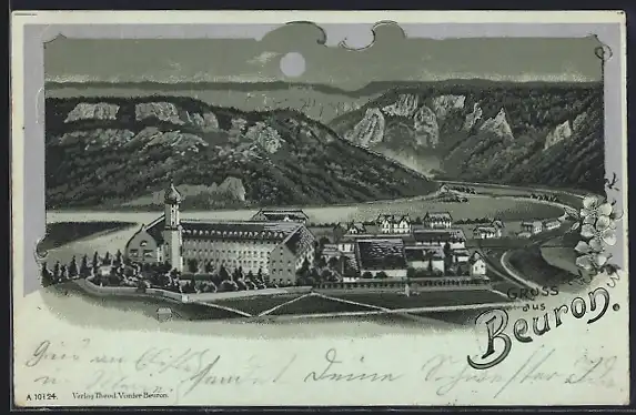 Mondschein-Lithographie Beuron, Ortsansicht bei Nacht