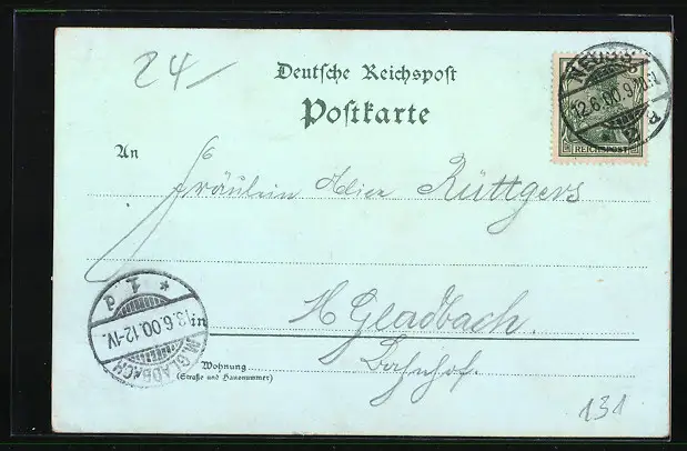 Personenbezogene Daten auf der Rückseite der Karte wurden durch blauen Textmarker unkenntlich gemacht. Die blauen Stellen sind auf die Vorderseite durchgeweicht und wirken sich negativ auf das Postkartenfoto aus