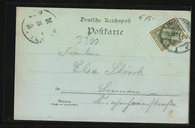 Personenbezogene Daten auf der Rückseite der Karte wurden durch blauen Textmarker unkenntlich gemacht. Die blauen Stellen sind auf die Vorderseite durchgeweicht und wirken sich negativ auf das Postkartenfoto aus