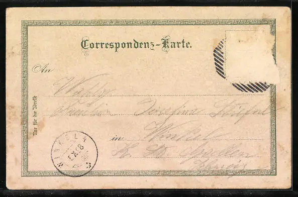 Personenbezogene Daten auf der Rückseite der Karte wurden durch blauen Textmarker unkenntlich gemacht. Die blauen Stellen sind auf die Vorderseite durchgeweicht und wirken sich negativ auf das Postkartenfoto aus