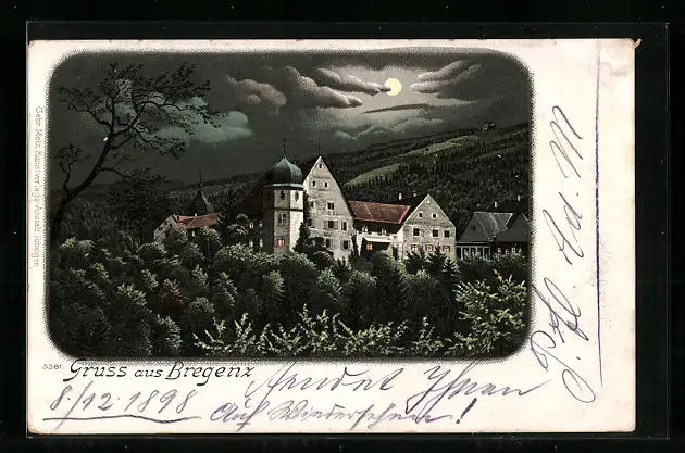 Mondschein-Lithographie Bregenz, Teilansicht mit Kirche