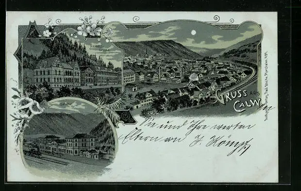 Mondschein-Lithographie Calw, Ortsansicht, Handelsschule, Bahnhof
