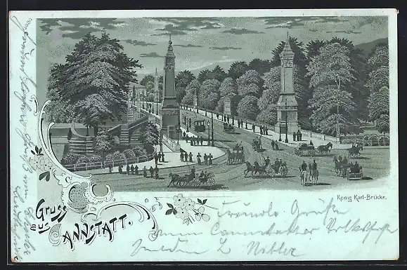 Mondschein-Lithographie Cannstatt, Strassenbahn und reger Verkehr an der König Karl-Brücke
