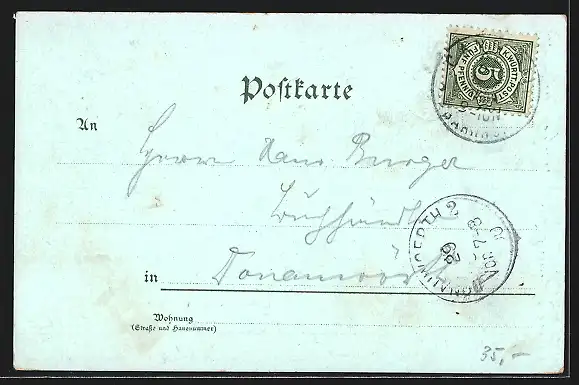Personenbezogene Daten auf der Rückseite der Karte wurden durch blauen Textmarker unkenntlich gemacht. Die blauen Stellen sind auf die Vorderseite durchgeweicht und wirken sich negativ auf das Postkartenfoto aus