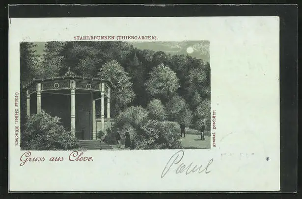 Mondschein-Lithographie Cleve, Stahlbrunnen im Tiergarten
