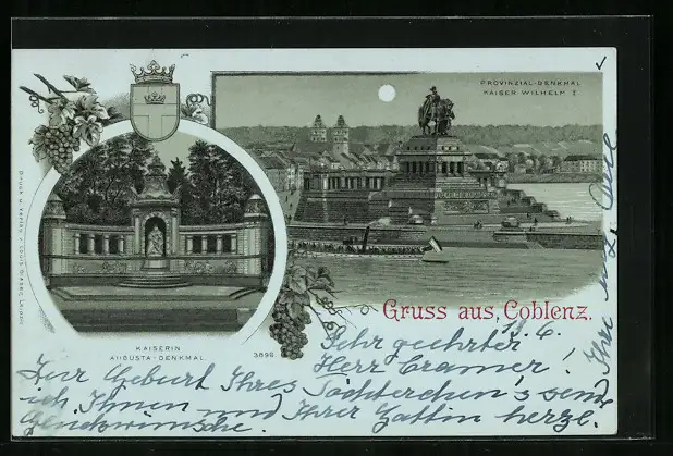Mondschein-Lithographie Coblenz, Provinzial-Denkmal, Kaiser Wihelm I