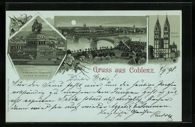 Mondschein-Lithographie Coblenz, Provinzial-Denkmal Kaiser Wilhelm I., Castorkirche, Panorama