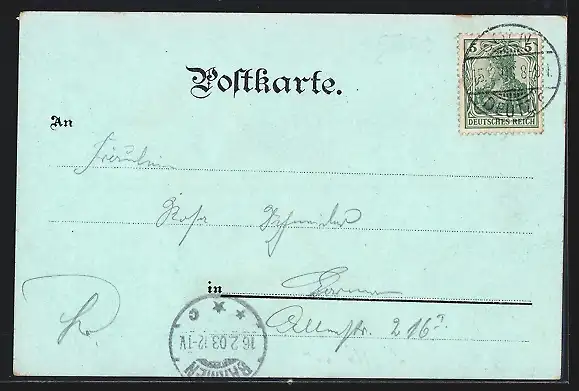Personenbezogene Daten auf der Rückseite der Karte wurden durch blauen Textmarker unkenntlich gemacht. Die blauen Stellen sind auf die Vorderseite durchgeweicht und wirken sich negativ auf das Postkartenfoto aus