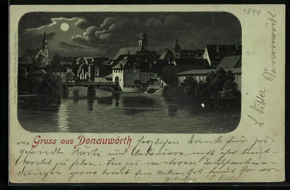 Mondschein-Lithographie Donauwörth, Ortsansicht mit Flusspartie