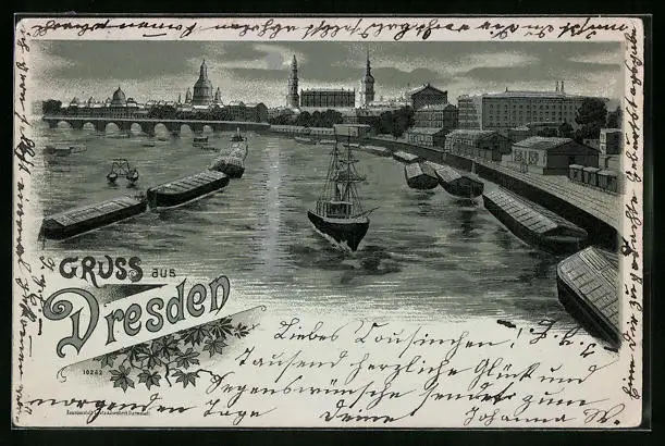 Mondschein-Lithographie Dresden, Ortsansicht von der Elbe aus mit Segelschiff und Lastkähnen