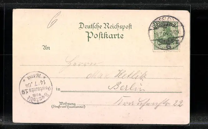 Personenbezogene Daten auf der Rückseite der Karte wurden durch blauen Textmarker unkenntlich gemacht. Die blauen Stellen sind auf die Vorderseite durchgeweicht und wirken sich negativ auf das Postkartenfoto aus
