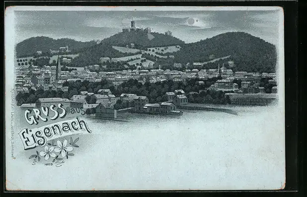 Mondschein-Lithographie Eisenach, Ortsansicht mit Kirche und Burg