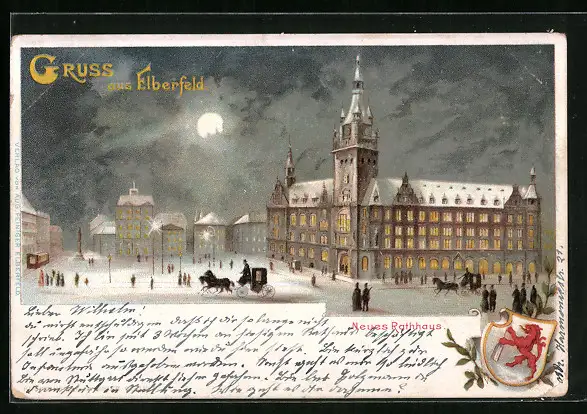 Mondschein-Lithographie Elberfeld, Neues Rathaus mit Wappen