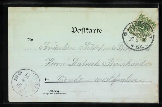 Personenbezogene Daten auf der Rückseite der Karte wurden durch blauen Textmarker unkenntlich gemacht. Die blauen Stellen sind auf die Vorderseite durchgeweicht und wirken sich negativ auf das Postkartenfoto aus